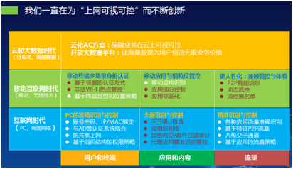 不管在過(guò)去的互聯(lián)網(wǎng)時(shí)代、現在的移動(dòng)互聯(lián)網(wǎng)時(shí)代,還是即將到來(lái)的云和大數據時(shí)代,一直致力于實(shí)現上網(wǎng)的可視可控,并不斷為之創(chuàng )新: