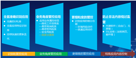 通過(guò)四個(gè)步驟來(lái)實(shí)現“應用和內容”的可視可控:首先全面精準識別應用,然后基于業(yè)務(wù)視角管控應用,其次更細粒度的管控應用,最后對于特殊應用內容進(jìn)行定向精準識別與管控。